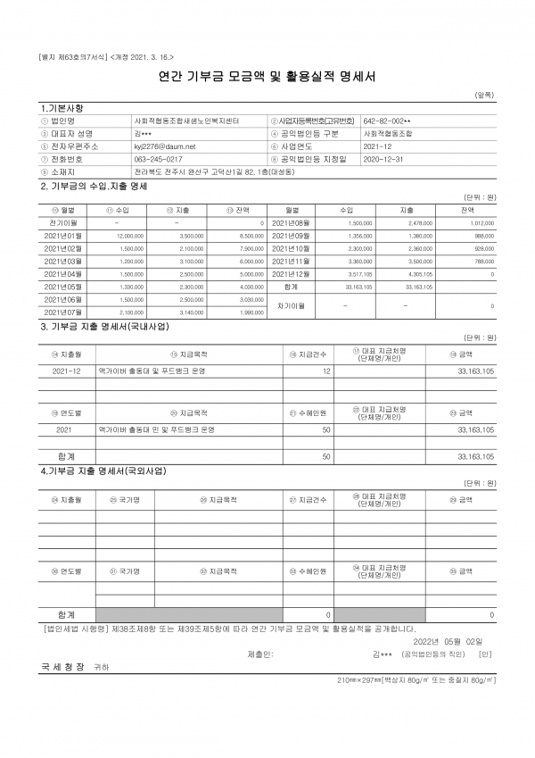 2021년 연간기부금 내역 및 활용실적 공개